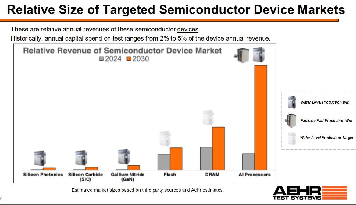 AEHR在AI领域,目前拥有晶圆级老化测试(WLBI)和封装级老化测试(PPBI)两个层级的产品,这就比当初在碳化硅领域仅拥有晶圆级老化测试产品要强,产品的覆盖面要广。当前两大客户(我认为是Cerebras和谷歌)不仅自己在行业内的发展形势看好,而且在AEHR这里下订单也是金额越来越大:前者两次合同从1000万,上升到1400万;后者第一次下单6套系统(推测价值1000万美元),第二年连续两单(8套+6套),第三年刚刚前不久为其最新一代芯片下了初始订单(虽然未公布金额,但AEHR预计今年应该能超过去年)。