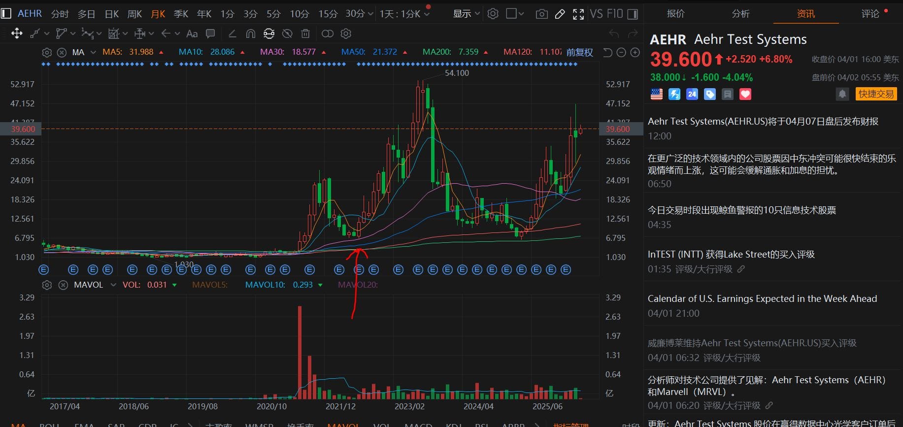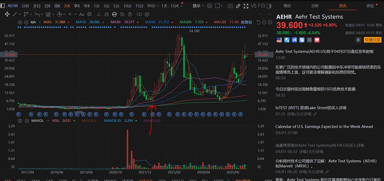 上面的图是AEHR的月K线图,我大概是从22年下半年(图中红色箭头处)开始关注研究AEHR的,经历过从8元—》50元—》8元—》40元(现在)的跌宕起伏。