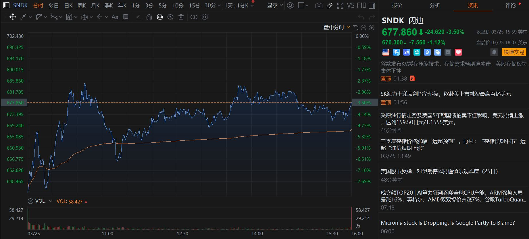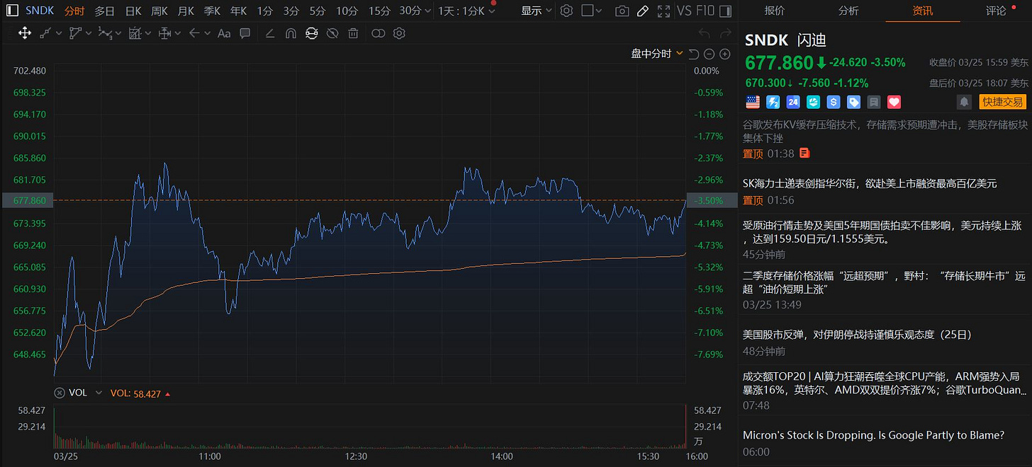 26年3月25日美股盘前, 一则新闻(谷歌发布KV缓存压缩技术)开始迅速传播开来. 美股存储板块四巨头$MU, $SNDK, $STX , $WDC纷纷低开(平均跌幅在6%), 但开盘一小时内就跌幅收窄, 最终收盘时平均跌幅在3%左右.